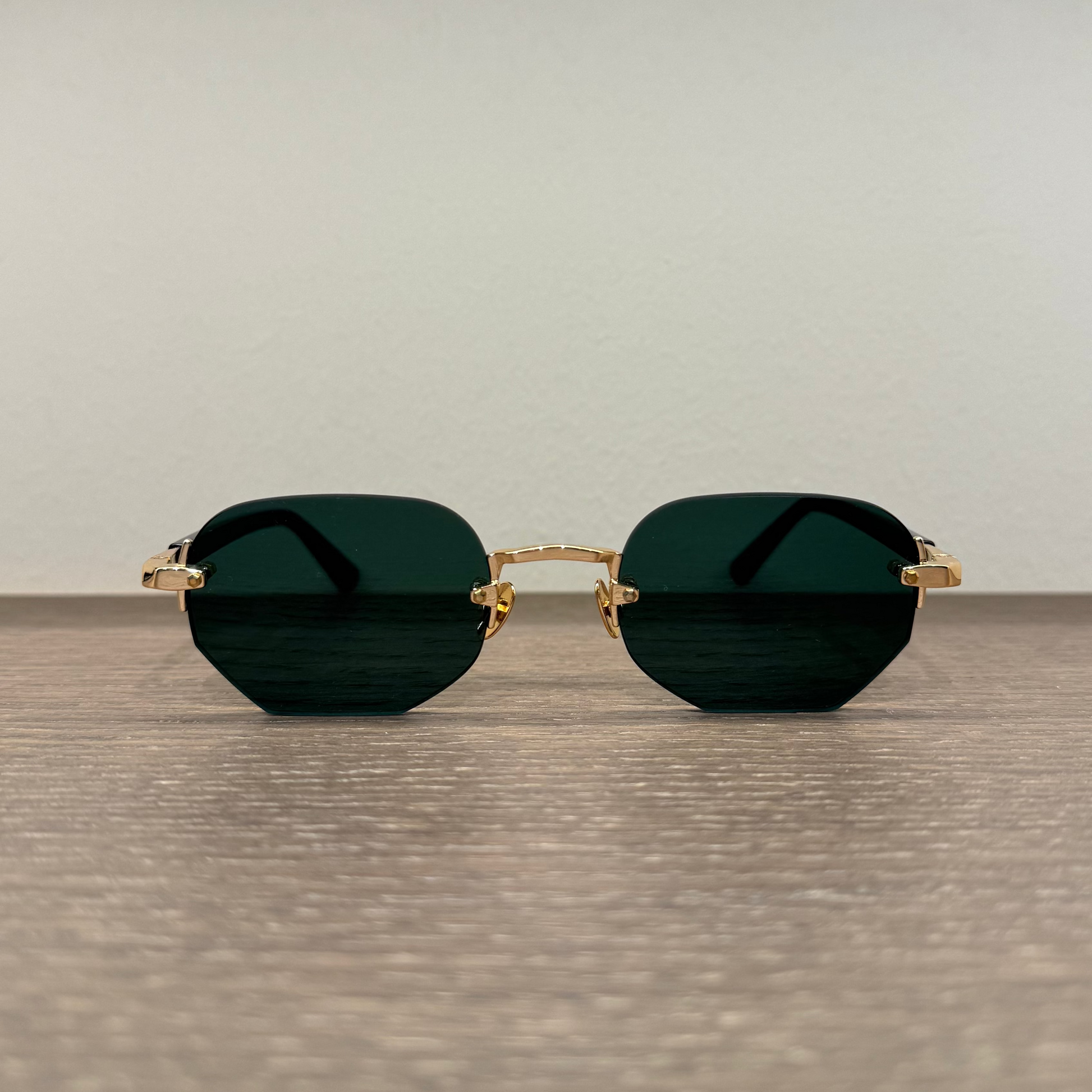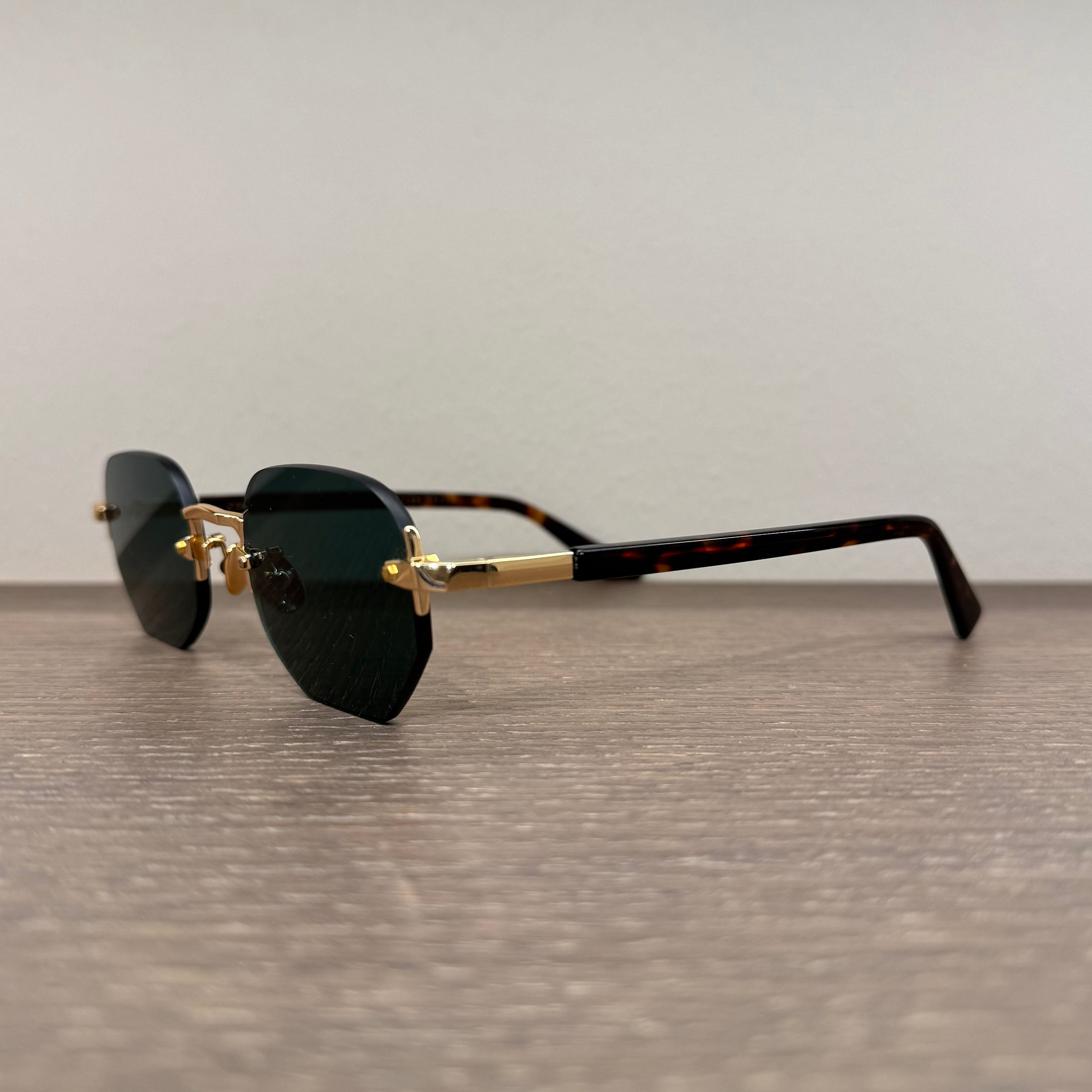 Occhiali da sole con montatura con inserti in metallo oro e aste in celluloide di colore tartarugato, lenti verdi con antiriflesso interno.