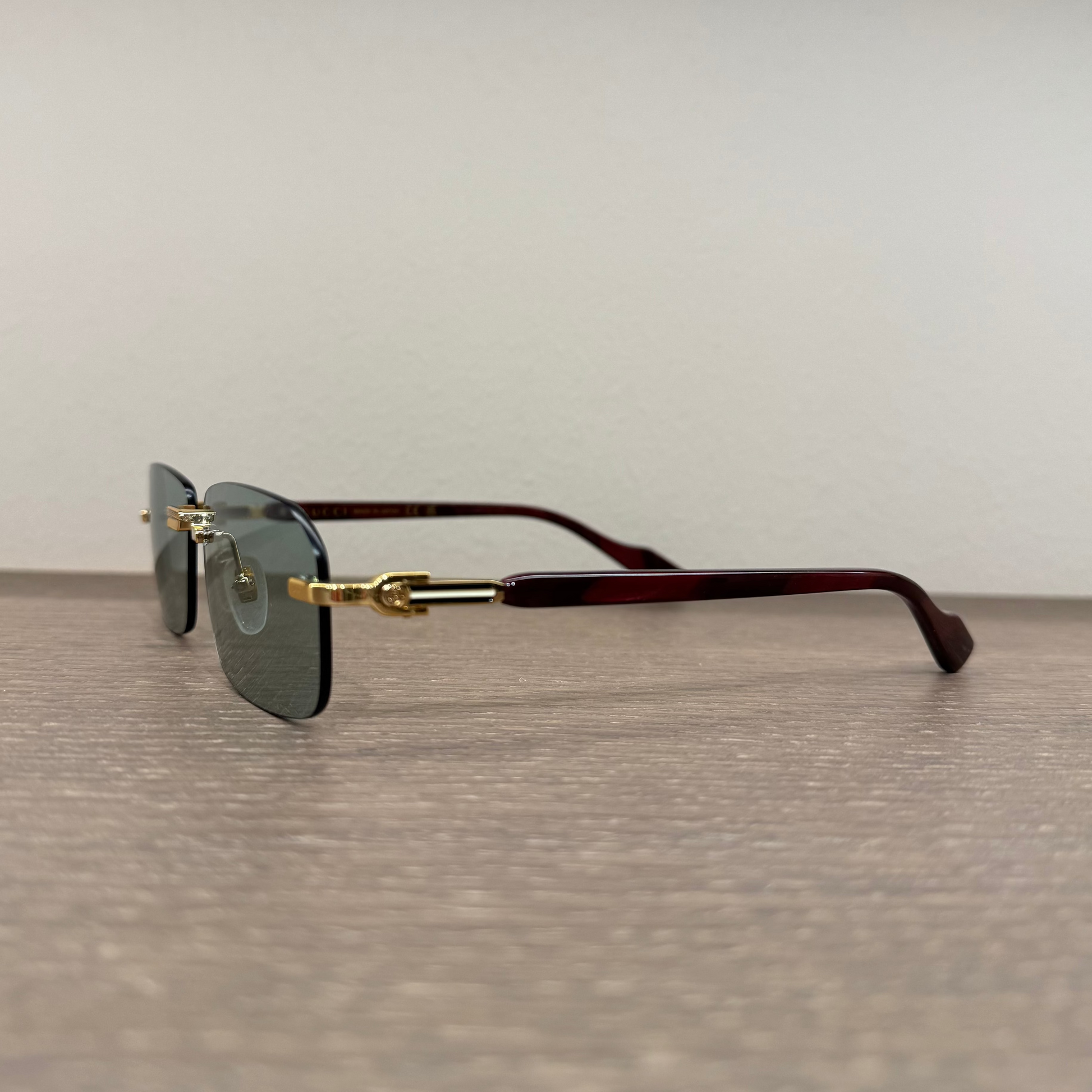 Occhiali da sole con montatura con inserti in metallo oro e aste in celluloide di colore burgundy, lenti verdi chiare.