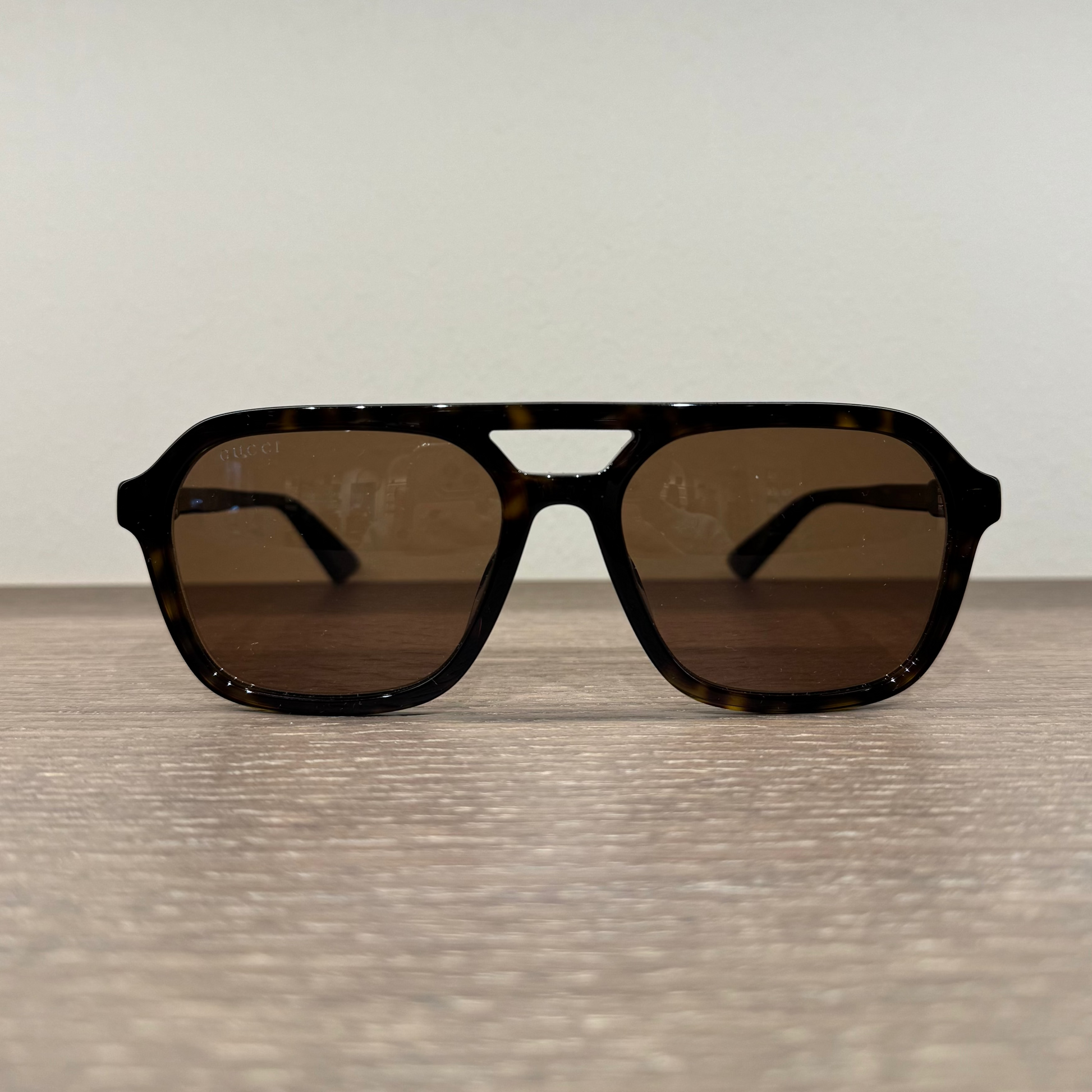 Occhiali da sole con montatura in celluloide di colore tartaruga chiaro, logo oro e lenti marroni.