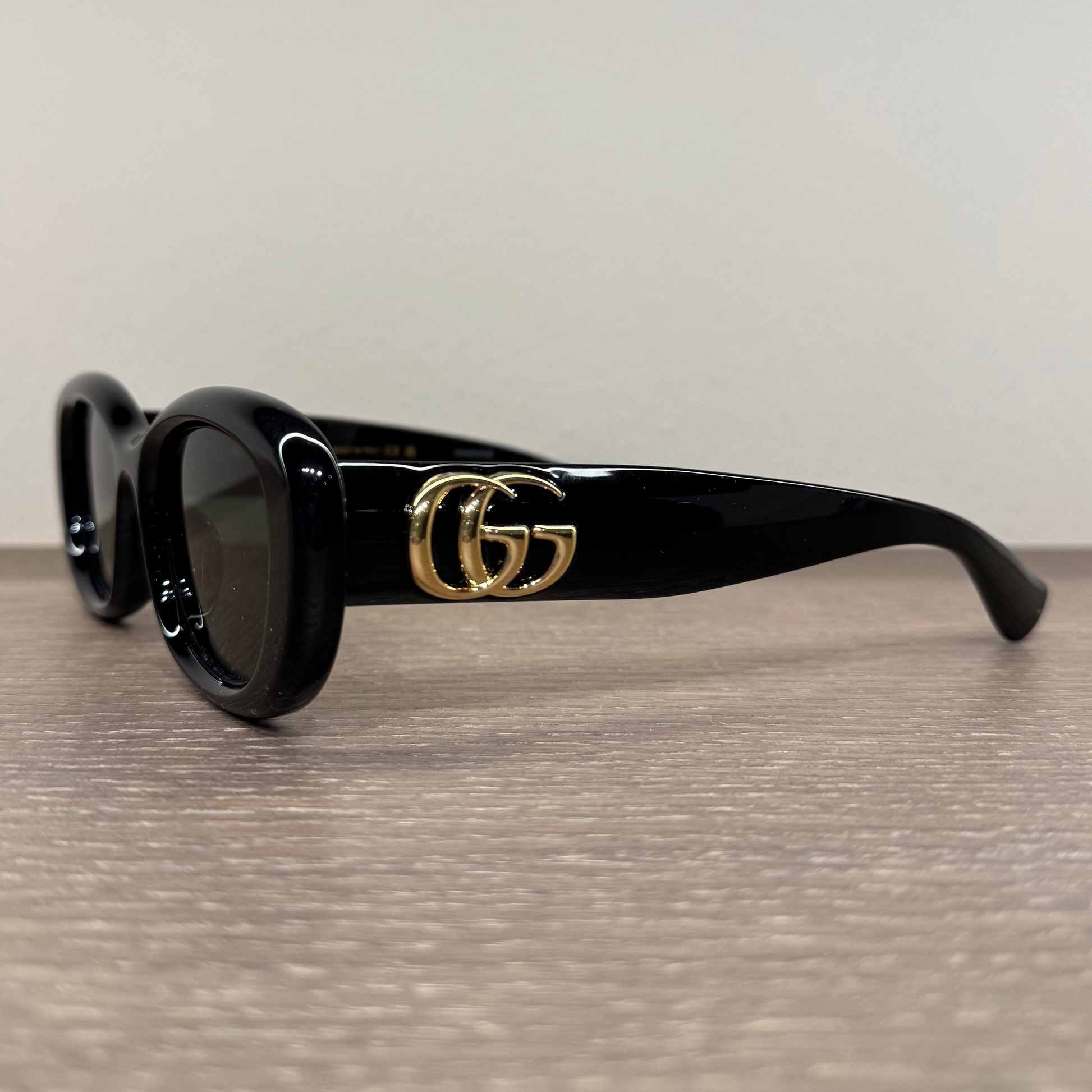 Occhiali da sole con montatura in celluloide di colore nero, logo in rilievo oro, lenti grigie.
