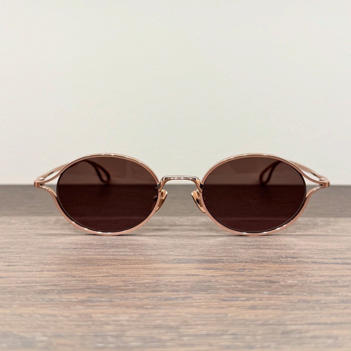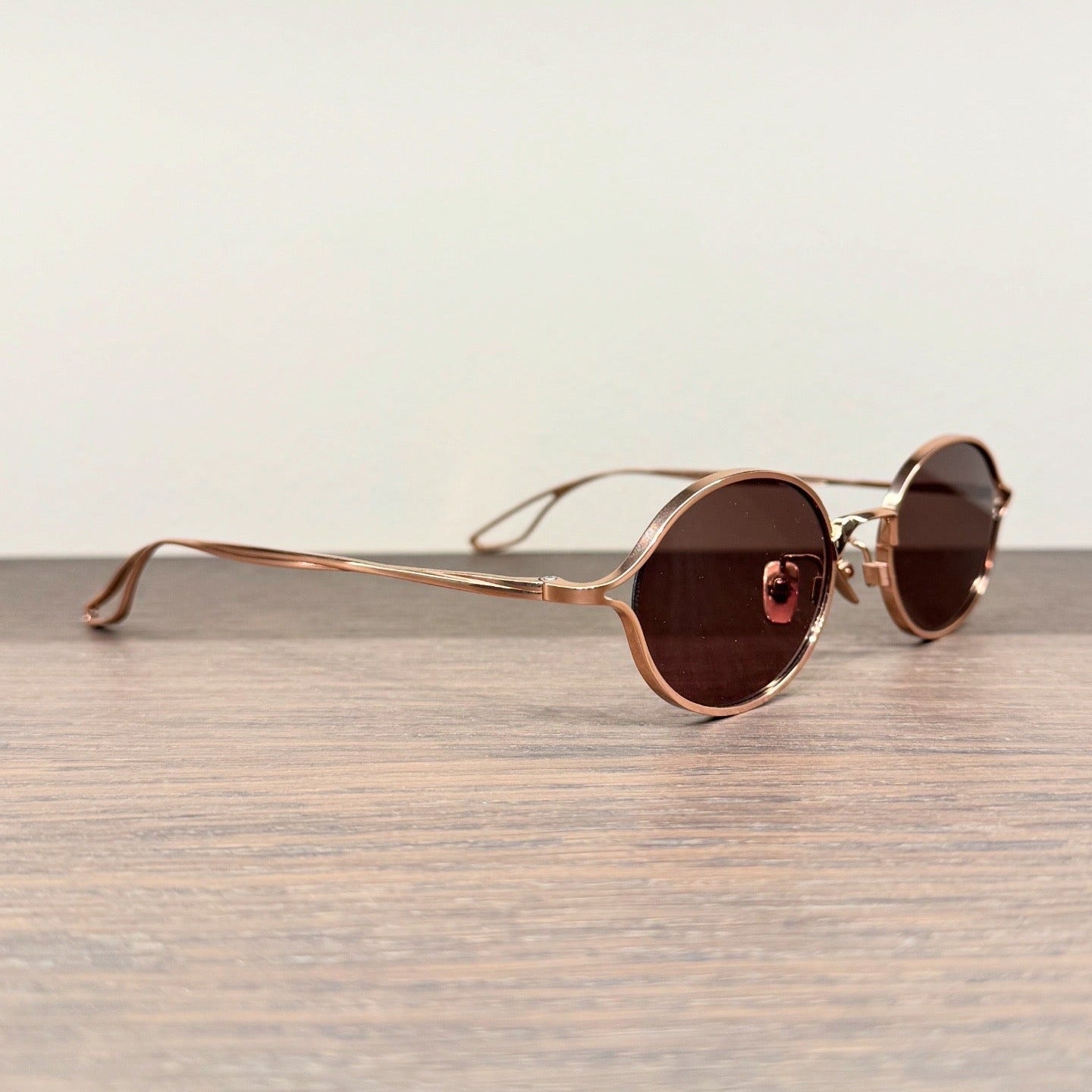 Occhiali da sole con montatura in titanio di colore oro rosa e lenti marroni con trattamento antiriflesso interno.