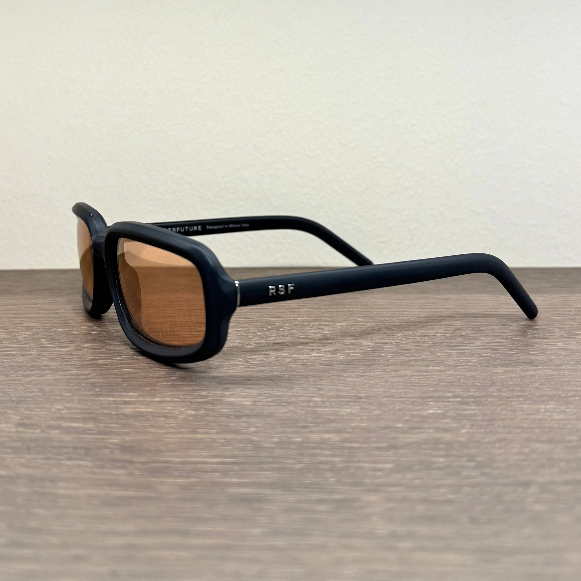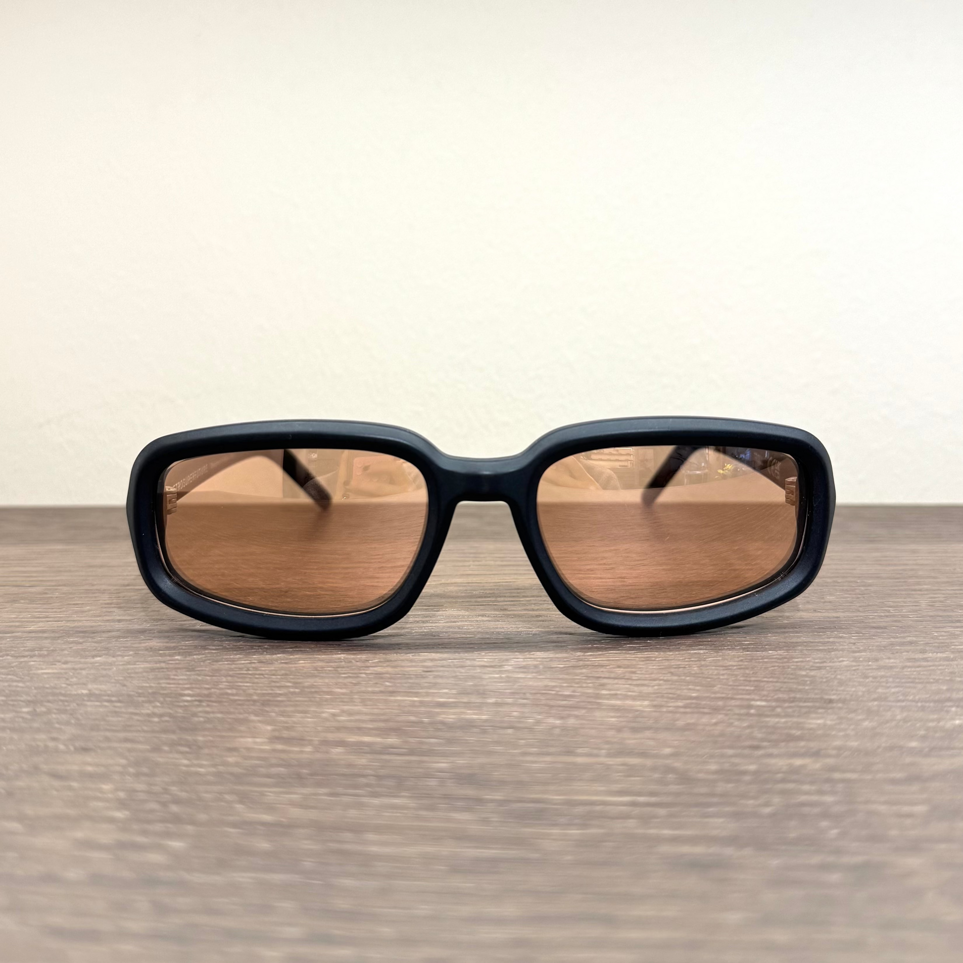 Occhiali da sole con montatura a mascherina avvolgente in celluloide di colore nero satinato, lenti specchiate rosa.