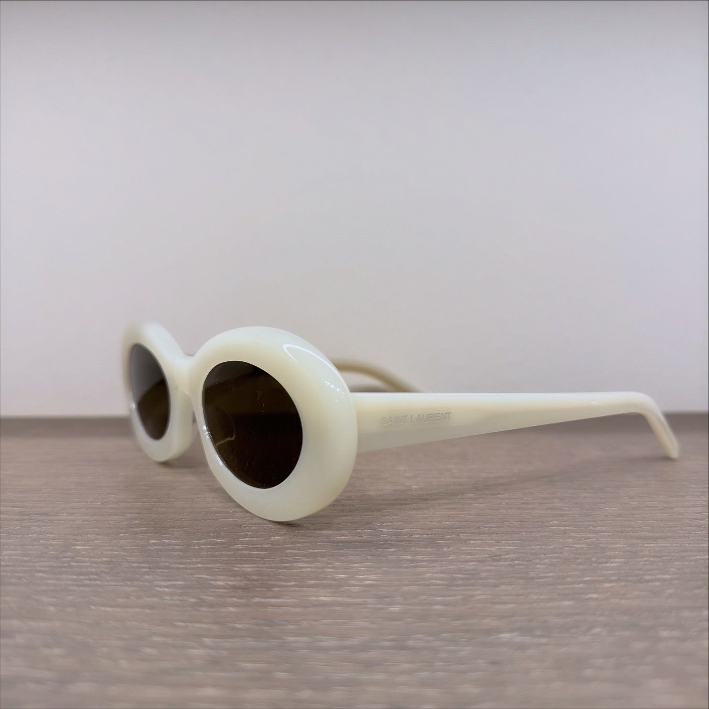 Occhiali da sole con montatura in celluloide di colore bianco panna, lenti marroni