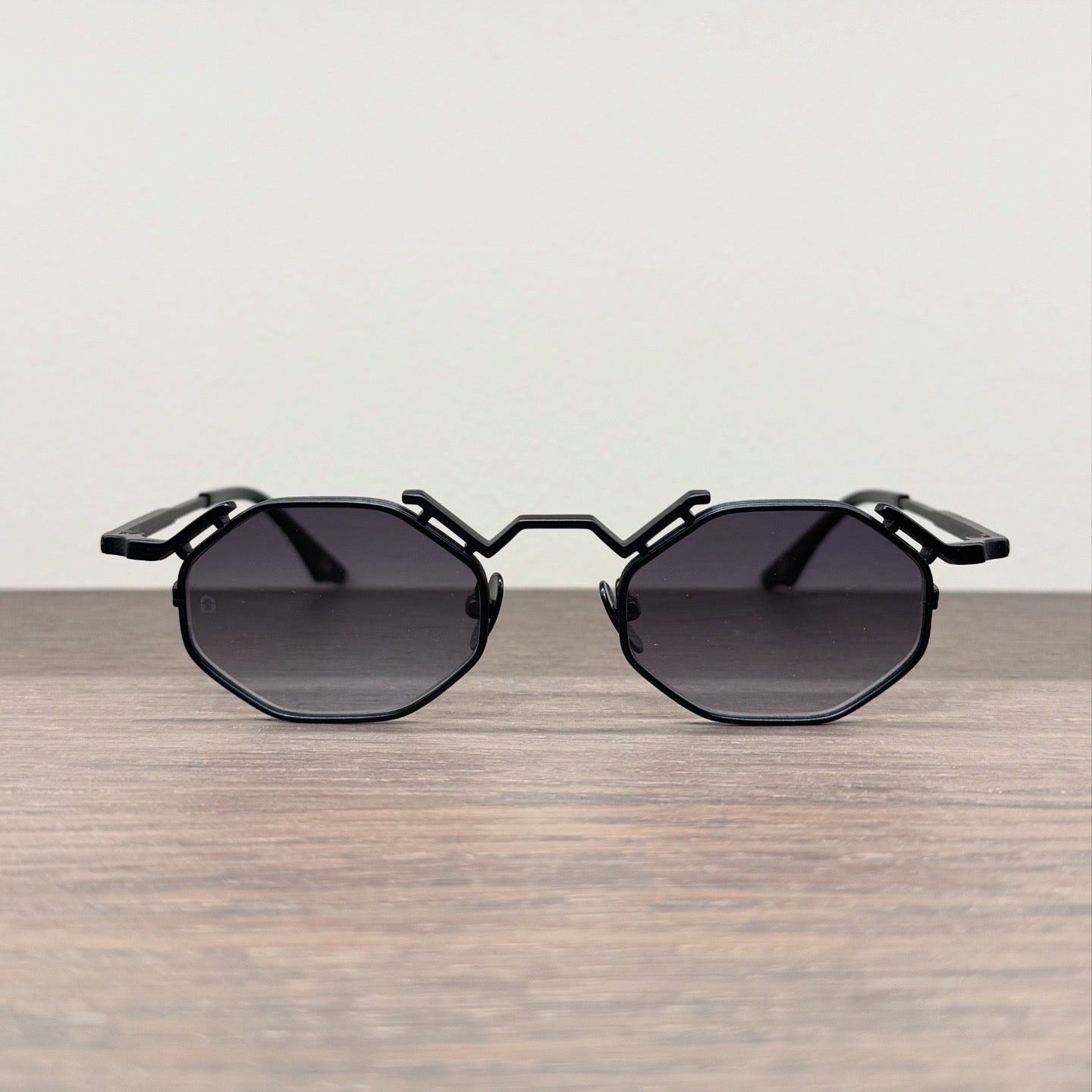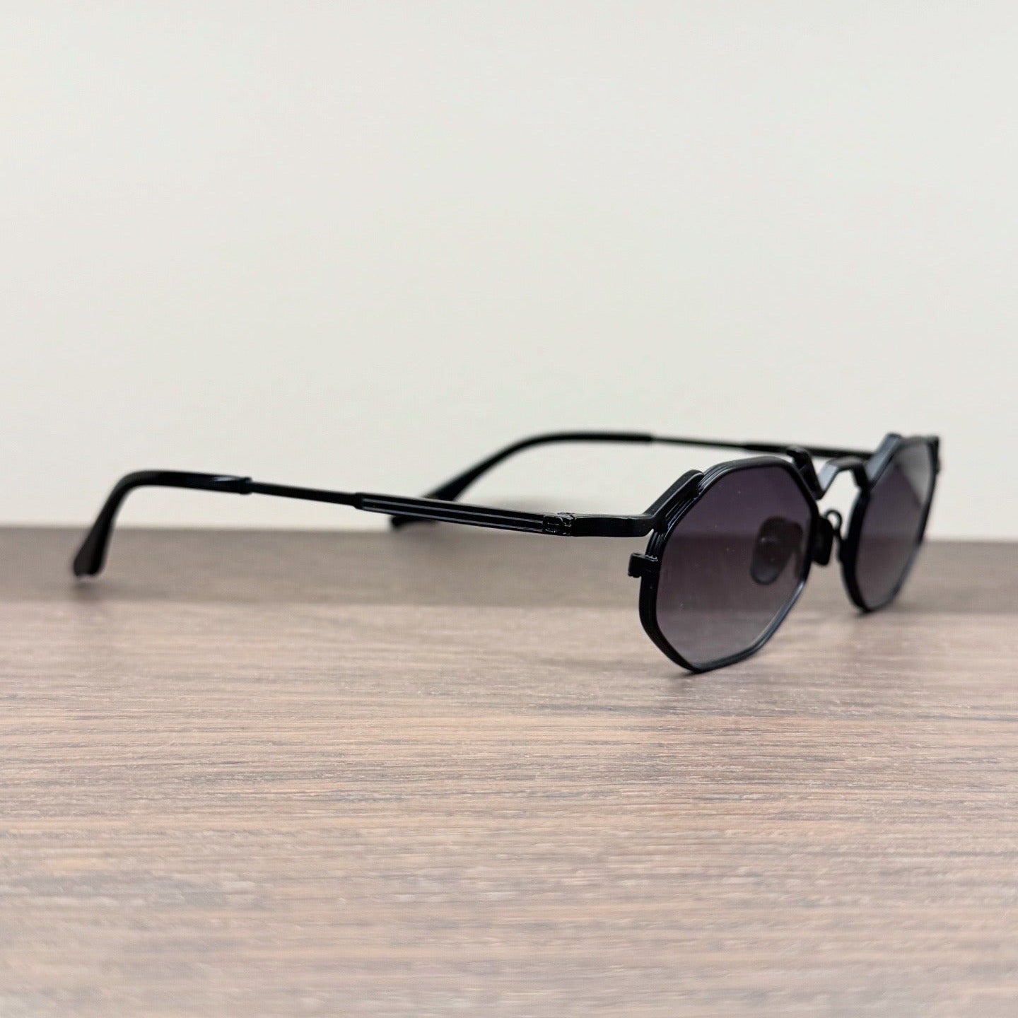 Occhiali da sole con montatura in metallo di colore nero e lenti grigie.
